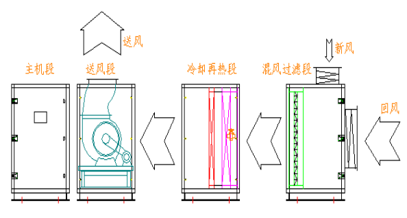 地下工程用除濕空調機采用模塊化設計理念和組合式結構,由混風過濾段、冷卻再熱段、送風段和主機段組合而成。自由拼裝,連接簡單,拆卸方便。